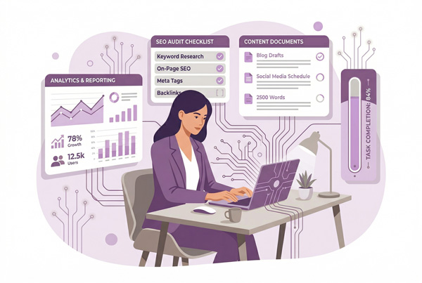 SEO設計、コンテンツ制作、データ分析、内部改善の提案と実装まで、必要な実務を一括でお任せいただけます。